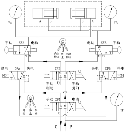 手動制動:電磁閥在失電的狀態(tài)下,方可轉(zhuǎn)為手動操作。至手拉閥SFA、SFB、轉(zhuǎn)閥ZF1于手動狀態(tài),當(dāng)滿足機(jī)組停機(jī)條件時(shí),轉(zhuǎn)閥ZF2轉(zhuǎn)到手動制動狀態(tài),使氣體進(jìn)入制動腔,制動器動作加速機(jī)組停機(jī)。